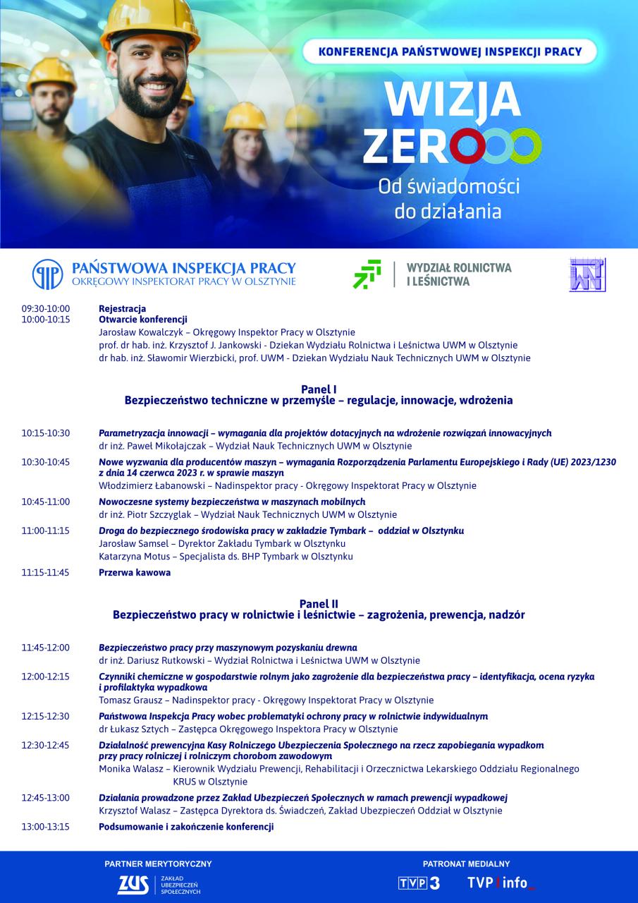 Okręgowy Inspektorat Pracy w Olsztynie wraz z Uniwersytetem Warmińsko-Mazurskim zapraszają do udziału w konferencji naukowej pt. „Postęp w inżynierii bezpieczeństwa. Wizja Zero - od świadomości do działania”, która odbędzie się 21 kwietnia 2026 r. w Olsztynie.