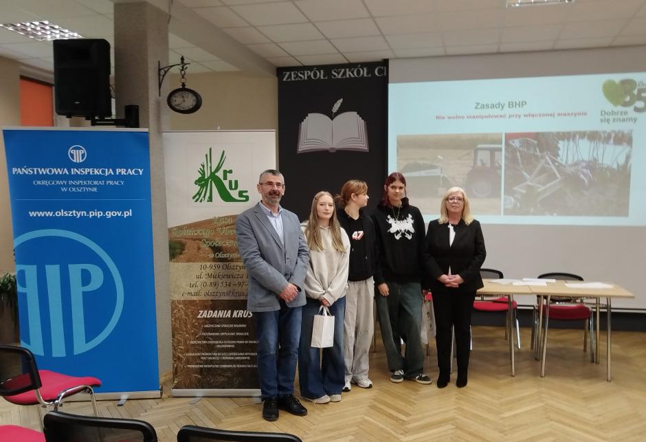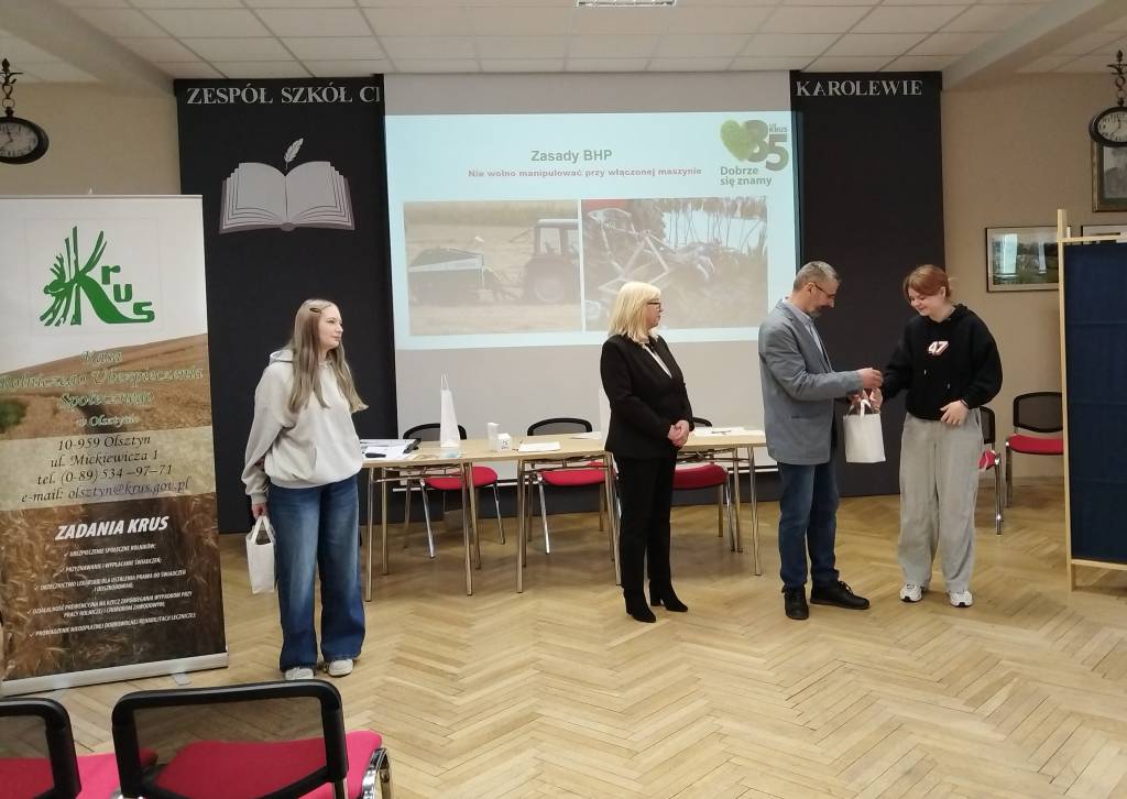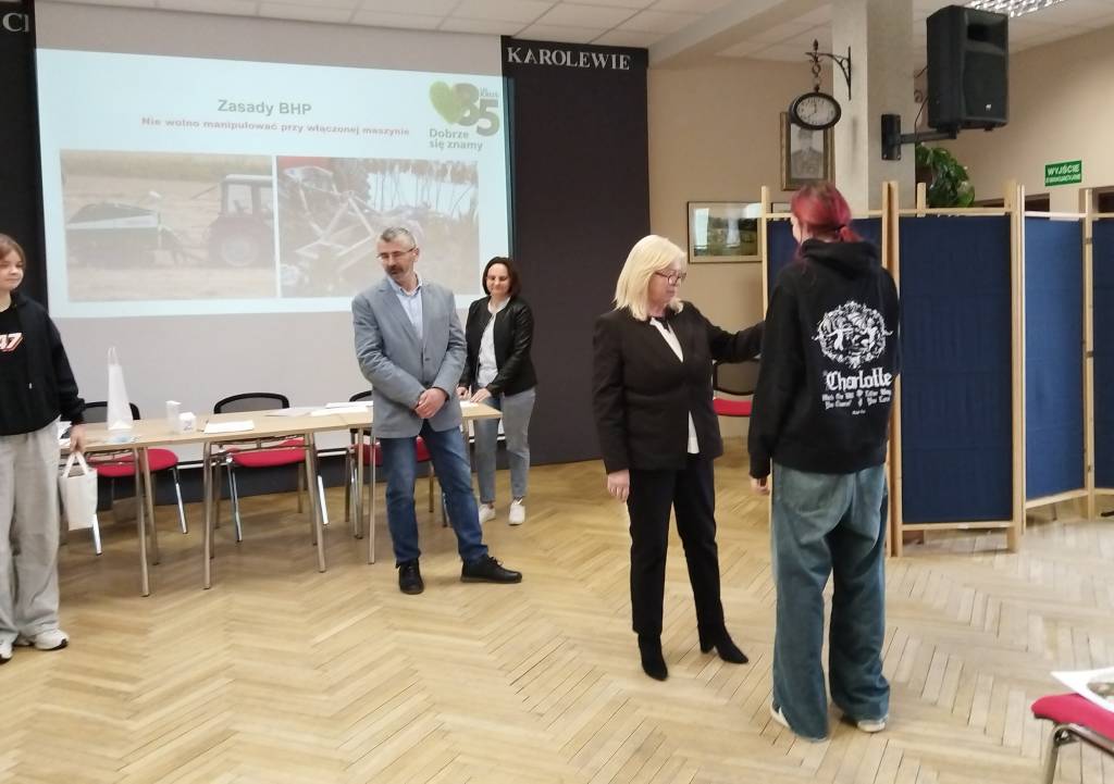 W dniu 15.04.2026 r. w Zespole Szkół Centrum Kształcenia Rolniczego im. gen. Franciszka Kamińskiego w Karolewie odbył się konkurs wiedzy z zakresu bezpieczeństwa i higieny pracy w rolnictwie. Wydarzenie zrealizowano w ramach działań informacyjno-edukacyjnych skierowanych do rolników indywidualnych pod hasłem „Szanuj życie! Bezpieczna praca w gospodarstwie rolnym”.