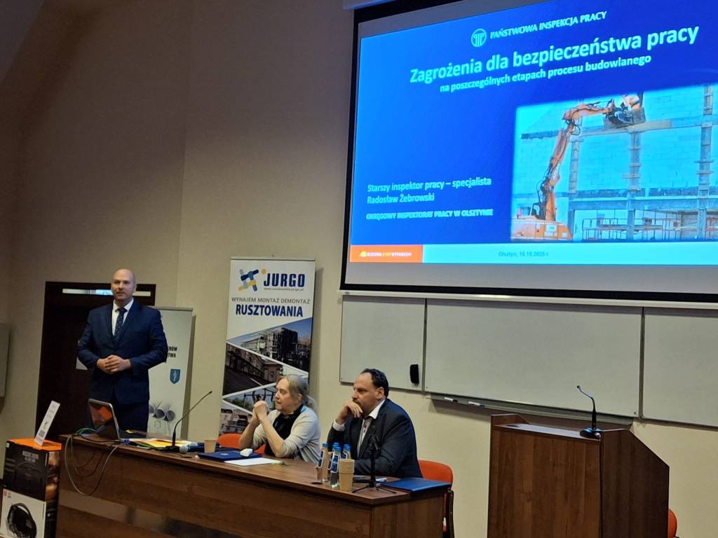 Jednym z prelegentów był Radosław Żebrowski, starszy inspektor pracy – specjalista, który wygłosił prelekcję pt. „Zagrożenia dla bezpieczeństwa pracy na poszczególnych etapach procesu budowlanego”.