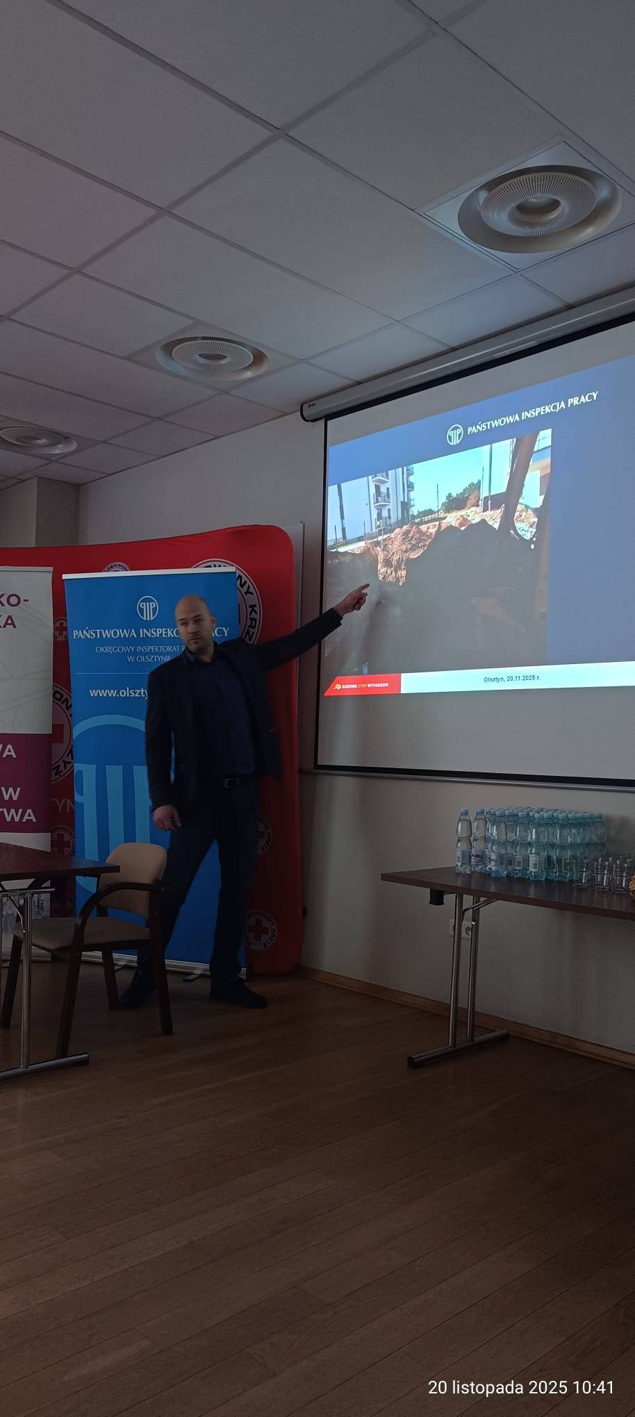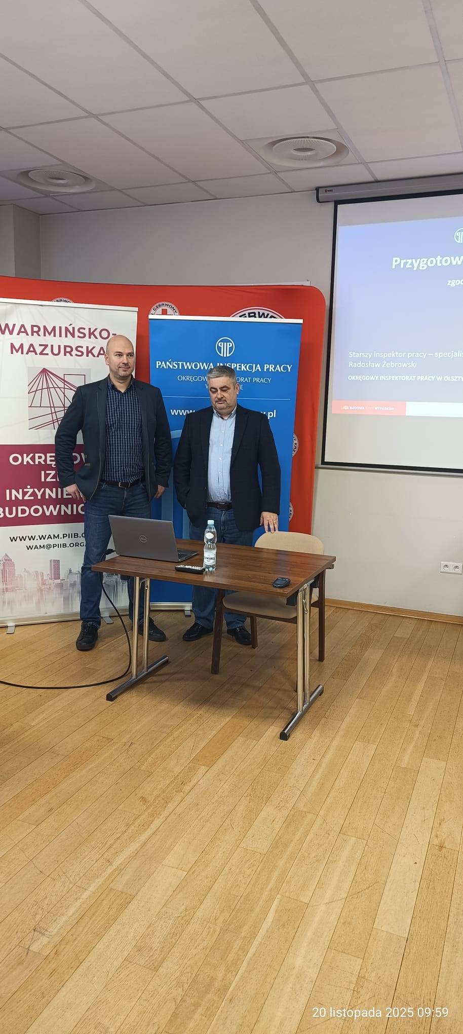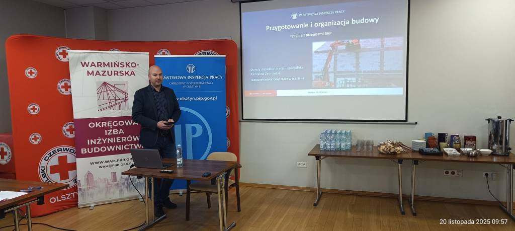 20 listopada 2025 r. inspektorzy pracy Okręgowego Inspektoratu Pracy w Olsztynie – Radosław Żebrowski oraz Jarosław Onufrijuk – przeprowadzili szkolenie dotyczące przygotowania i organizacji budowy zgodnie z przepisami bezpieczeństwa i higieny pracy.
