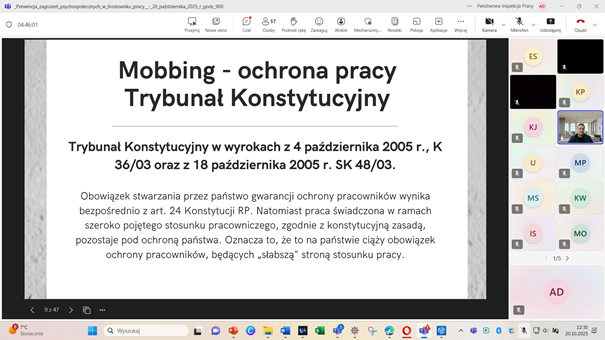 Drugą część spotkania poprowadził referent prawny Filip Czarnecki, który przedstawił zagadnienia prawne dotyczące mobbingu, odnosząc się do aktualnych regulacji Kodeksu pracy oraz praktycznych aspektów orzecznictwa.