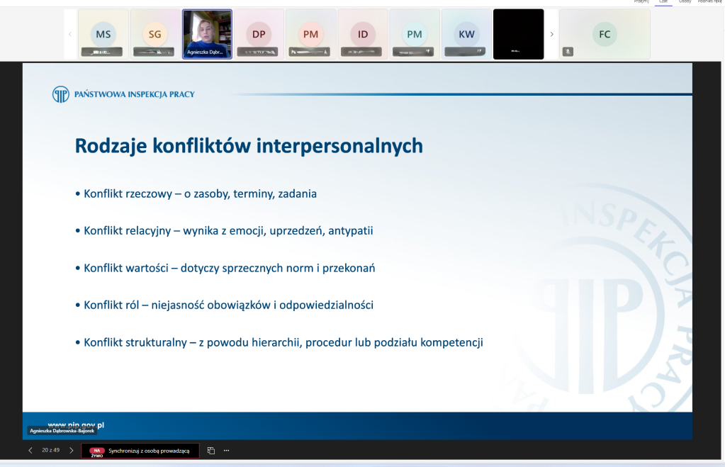 Pierwszą część szkolenia poprowadziła młodszy specjalista Agnieszka Dąbrowska-Bajorek, która omówiła tematykę prewencji zagrożeń psychospołecznych, ze szczególnym uwzględnieniem stresu zawodowego, konfliktów, mobbingu, dyskryminacji i molestowania oraz działań profilaktycznych podejmowanych przez Państwową Inspekcję Pracy.