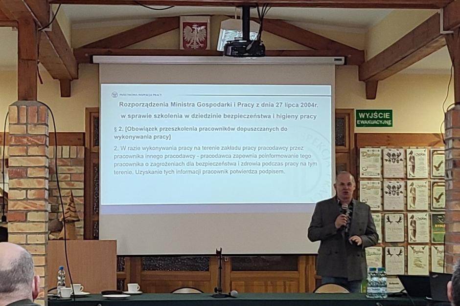 Podczas szkolenia omówiono kluczowe zagadnienia związane z organizacją bezpiecznej pracy w lesie. Szczególną uwagę poświęcono obowiązującym przepisom z zakresu bezpieczeństwa i higieny pracy, które regulują wykonywanie prac takich jak ścinka oraz zrywka drewna.