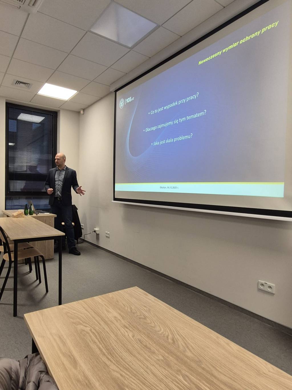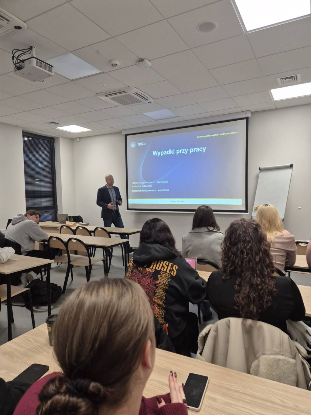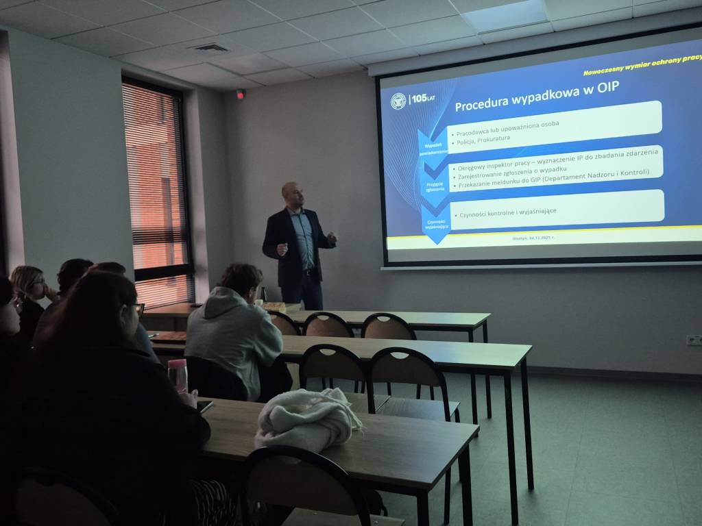 4 grudnia 2025 r. starszy inspektor pracy - specjalista Radosław Żebrowski z Okręgowego Inspektoratu Pracy w Olsztynie przeprowadził zajęcia dydaktyczne dla dwóch grup studentów Wydziału Prawa i Administracji Uniwersytetu Warmińsko-Mazurskiego w Olsztynie. W spotkaniu uczestniczyło łącznie około 40 studentów.