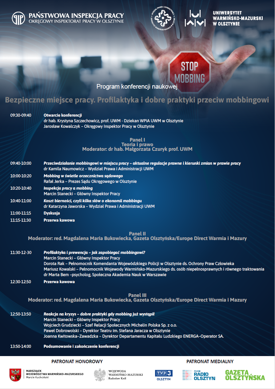Okręgowy Inspektorat Pracy w Olsztynie wraz z Uniwersytetem Warmińsko-Mazurskim zapraszają do udziału w konferencji naukowej pt. „Bezpieczne miejsce pracy. Profilaktyka i dobre praktyki przeciw mobbingowi”, która odbędzie się 23 października