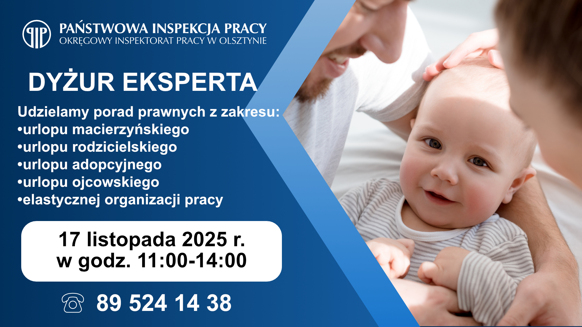 Okręgowy Inspektorat Pracy w Olsztynie zaprasza na dyżur eksperta, podczas którego będzie można uzyskać bezpłatne porady prawne dotyczące: